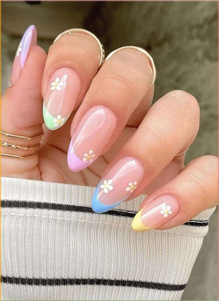 Nude nails with pastel accents create a soft and versatile summer manicure. Pastel colors can be applied as tips, stripes, or accent nails. This style pairs well with a wide variety of outfits, offering a chic and polished look for guests.
