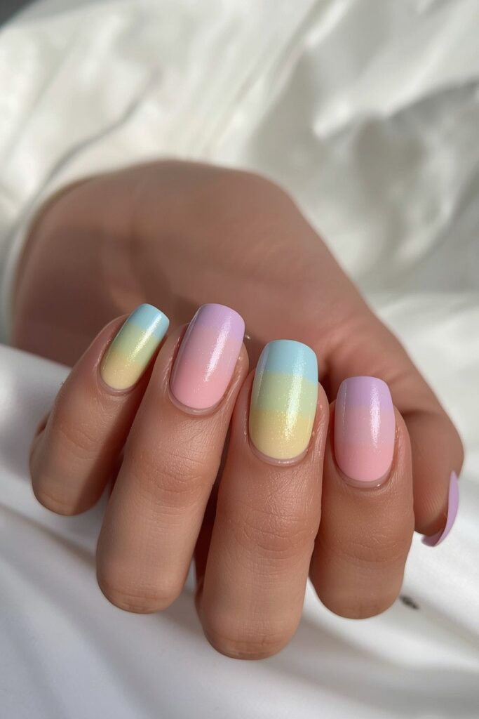 Pastel rainbow ombre nails offer a playful, colorful touch perfect for summer weddings. This gradient combines multiple soft shades, creating a stylish and unique manicure. Adding subtle shimmer or glitter accents elevates the look, making it perfect for guests who love fun yet elegant nails.