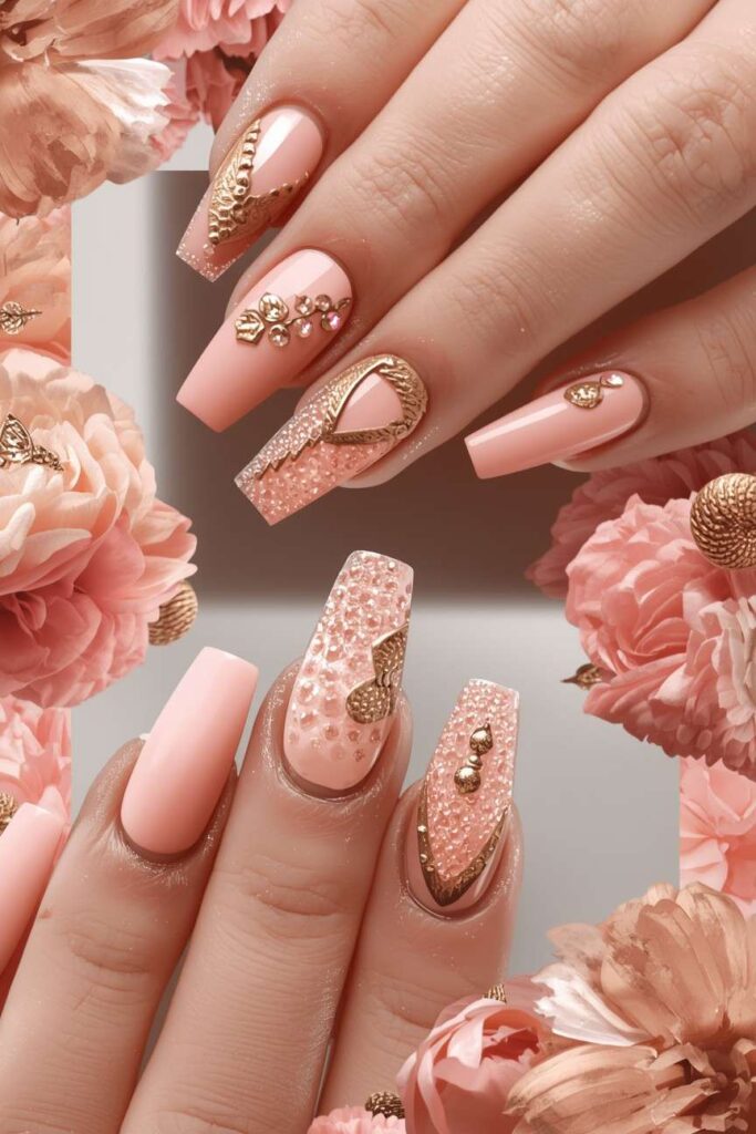 Peach nails with gold accents combine softness and sophistication. Gold foil, glitter, or metallic stripes on peach bases add a luxurious touch. This combination works beautifully for both daytime and evening weddings, making your manicure elegant and eye-catching. Perfect for guests who want subtle glam with a warm summer vibe.
