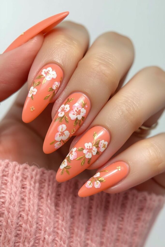 Peachy coral nails with delicate floral decals bring a feminine and whimsical vibe. This design pairs well with summer dresses and outdoor wedding themes. It’s perfect for guests who want an intricate yet charming manicure that’s both stylish and memorable.