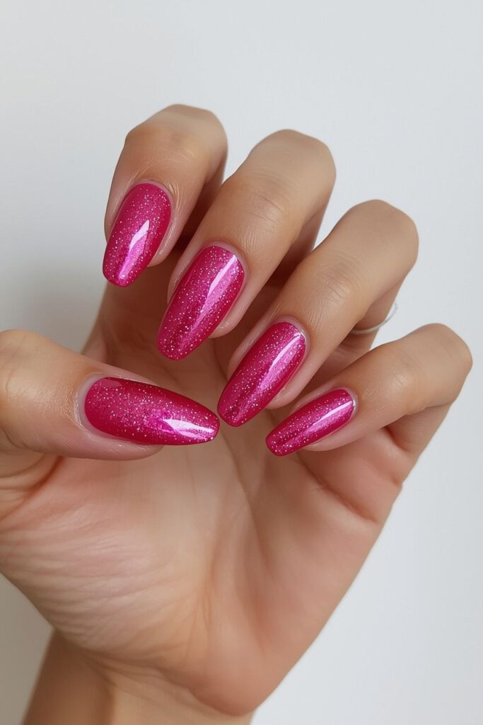 Pink glitter nails add fun, sparkle, and summer vibrancy. Ideal for evening receptions or festive ceremonies, this design balances glamour and elegance. Accent nails with rhinestones or glitter gradients enhance sophistication while keeping the look chic.