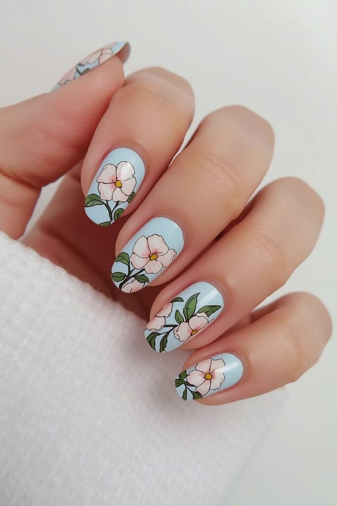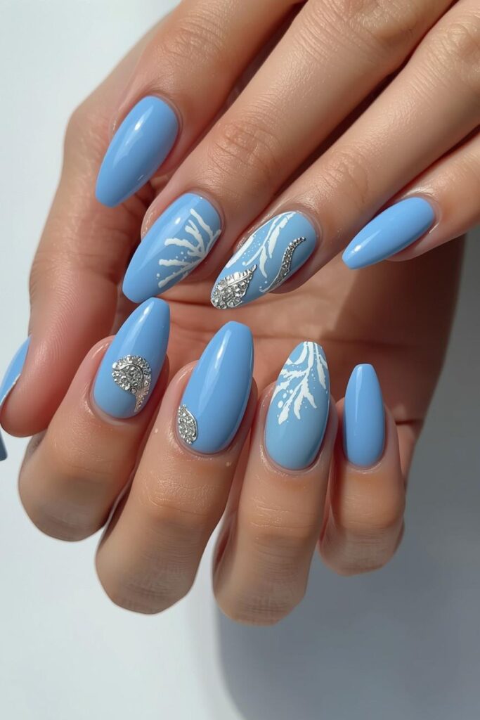 Soft blue nails paired with floral designs create a romantic, whimsical look. This manicure works well for garden or outdoor weddings. Adding subtle shimmer or rhinestones enhances the design, making it a stylish choice for summer wedding guests.