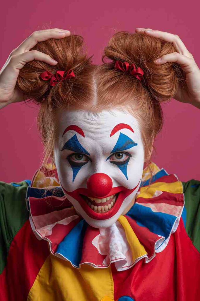 Pigtail buns add playful chaos, ideal for clown or harlequin costumes.