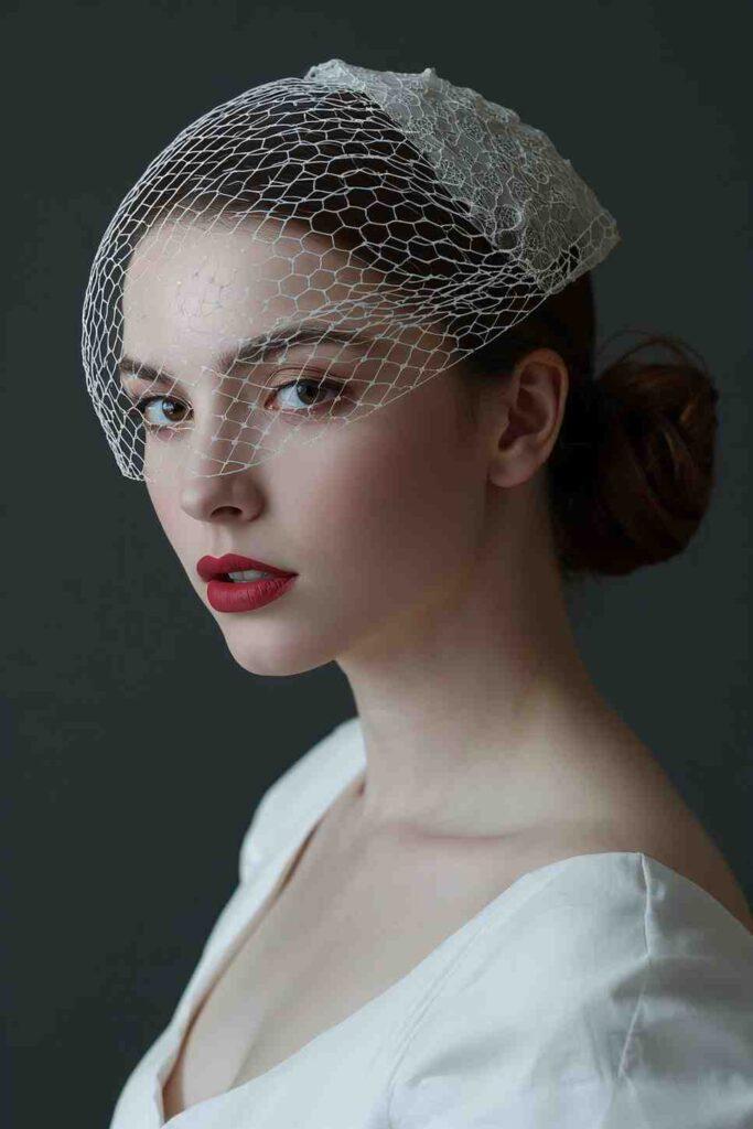 Style tips: Smooth hair back into a bun, secure a veil with pins, and finish with dark makeup.