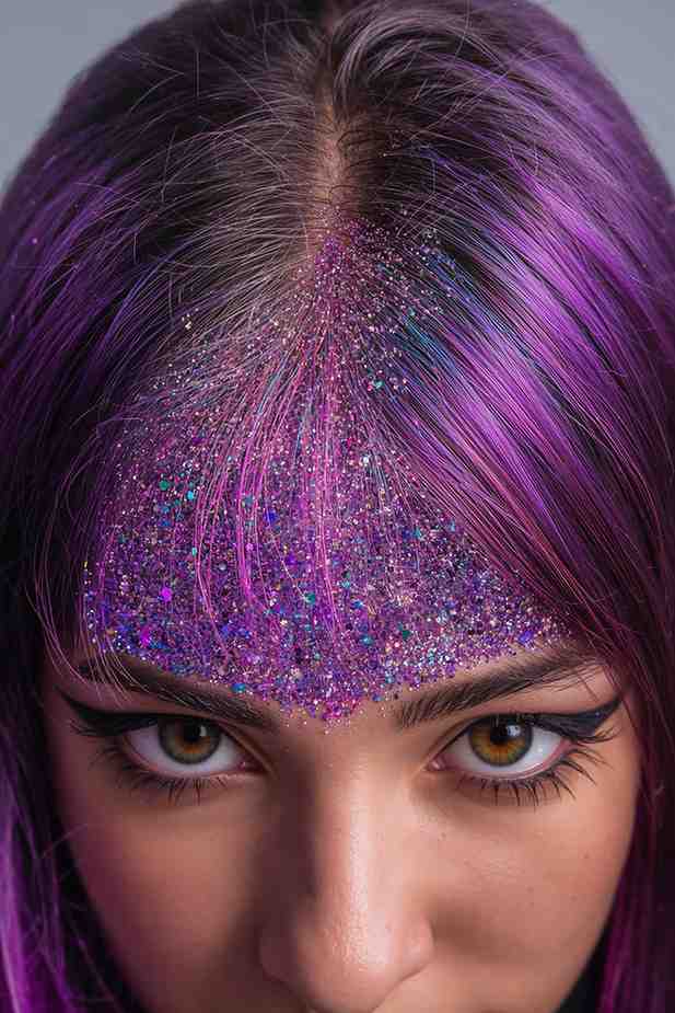 Style tips: Mix glitter with hair gel, apply along the part, and set with spray to avoid fallout.