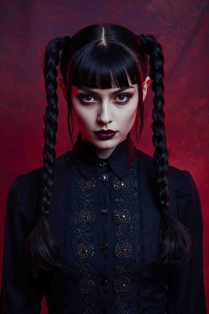 Style tips: Part hair sharply down the middle, secure low or high, and use black ribbons or dark accessories.