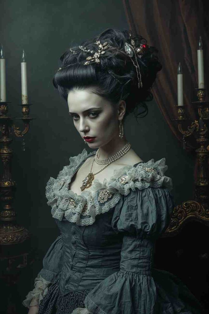 Style tips: Curl hair, pin sections into a loose chignon, and add lace or pearls. Tease lightly for a haunted finish.