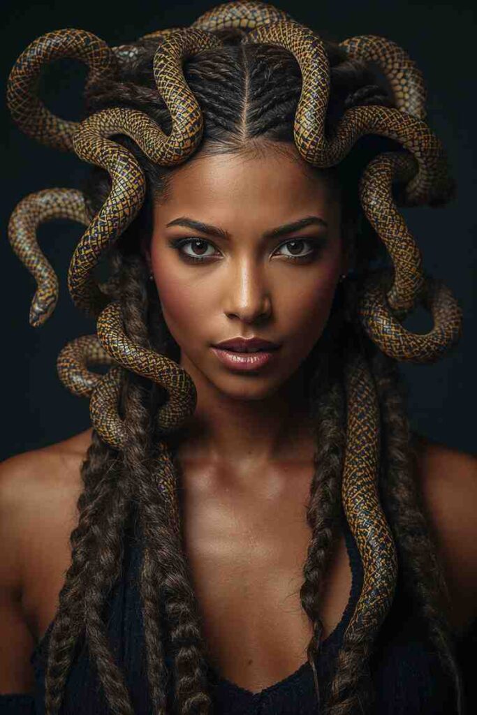 Braids intertwined with snake accessories or fake snakes create a striking Medusa look.