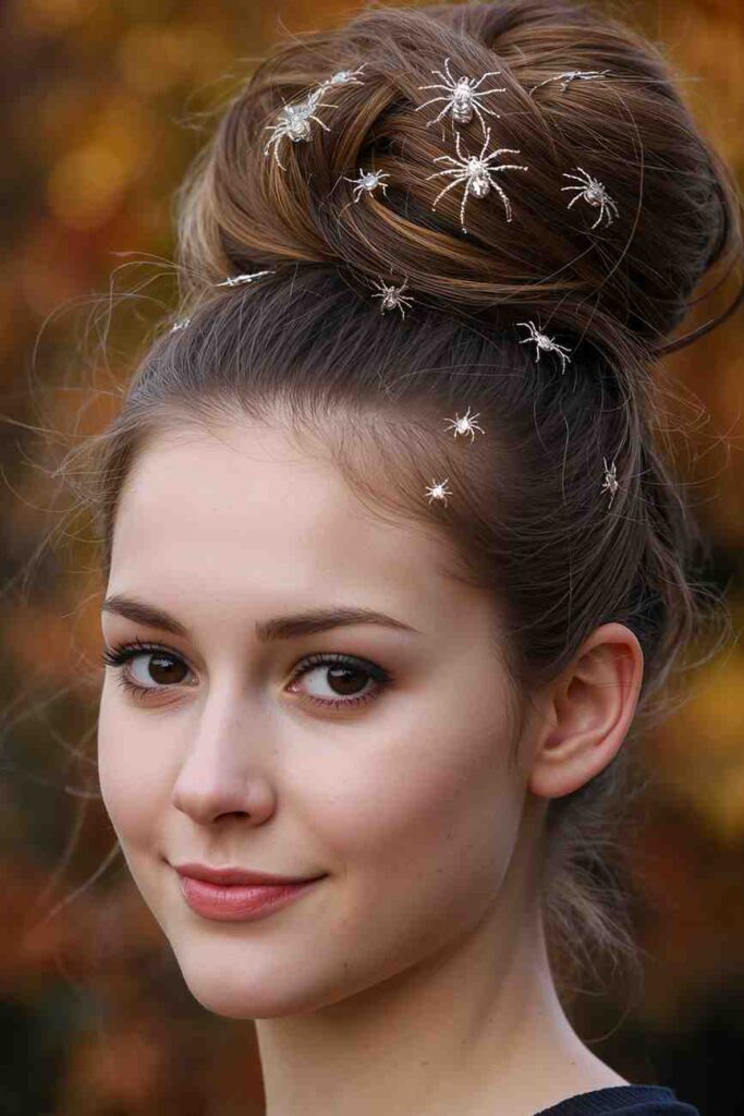 A high messy bun paired with tiny spider hair clips adds a spooky-cute twist to your Halloween look.