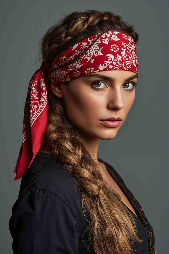 A long, textured braid with a bandana tied at the crown channels effortless pirate energy.