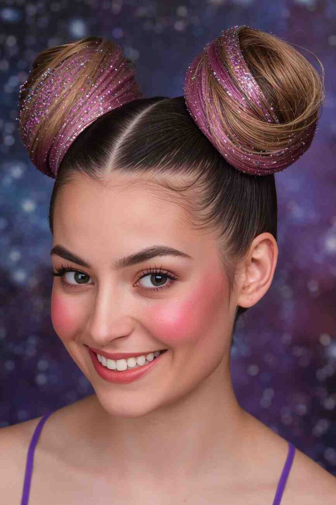 Perfect for alien, galaxy, or futuristic costumes, space buns with glitter make your hairstyle instantly playful and eye-catching.