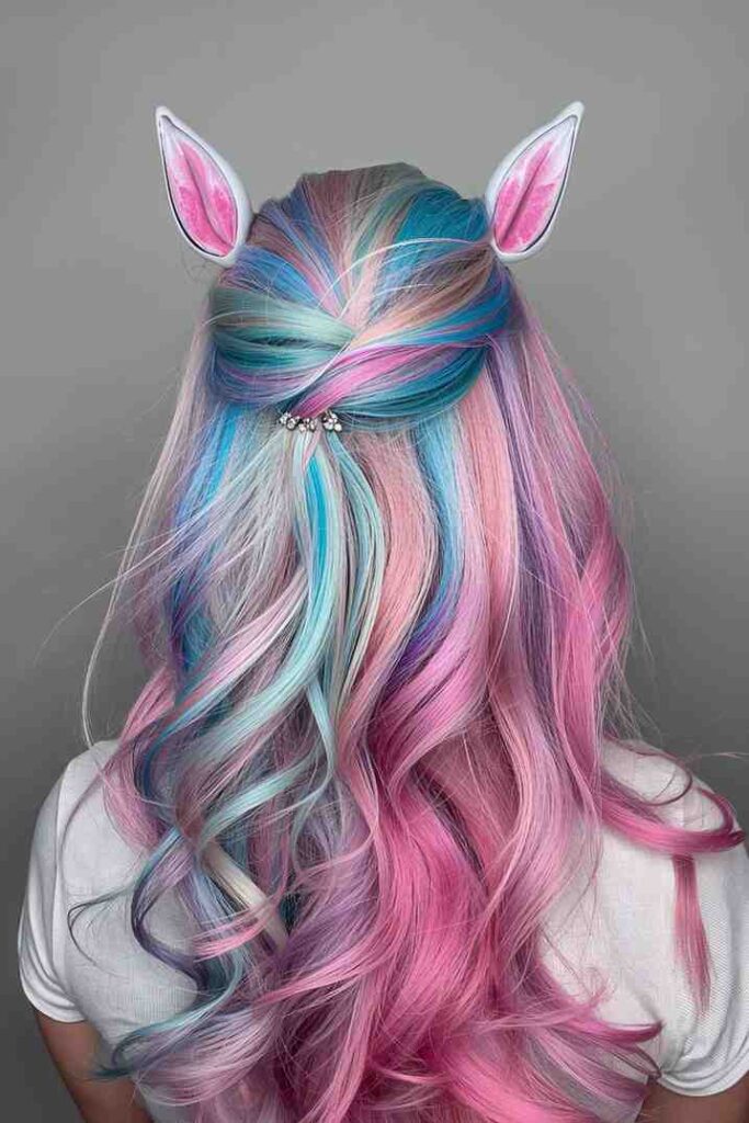 Pastel streaks or colored spray paired with loose curls give a dreamy unicorn effect.