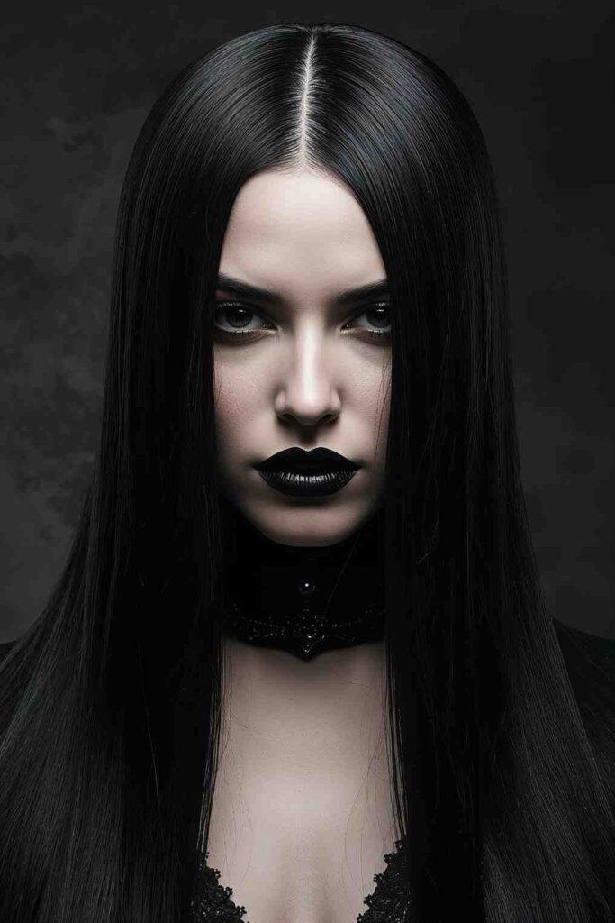 Sleek, straight hair with a sharp middle part gives off vampiric elegance—perfect for gothic or vampire looks.