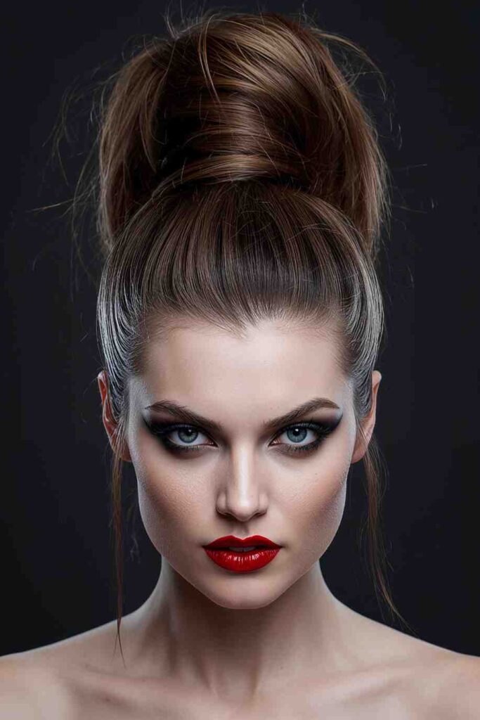 A high ponytail with volume and teasing gives a powerful witchy or villainous effect.