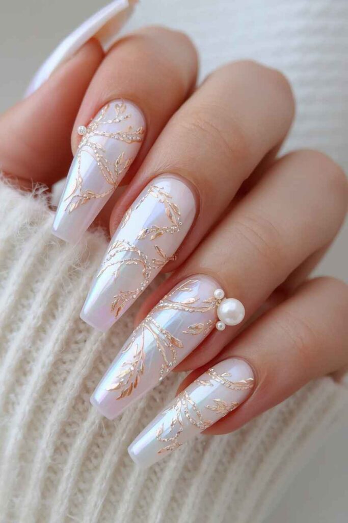 Pearl-inspired nails mimic the lustrous sheen of pearls, giving a soft, luxurious effect. This style complements bridal accessories such as pearl jewelry and adds a subtle glow to the hands. Pearl nails are timeless, feminine, and versatile, working with classic and modern gowns alike. The elegant shimmer enhances the manicure’s sophistication while keeping it understated and chic, perfect for the bride who loves subtle luxury.