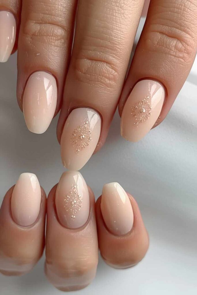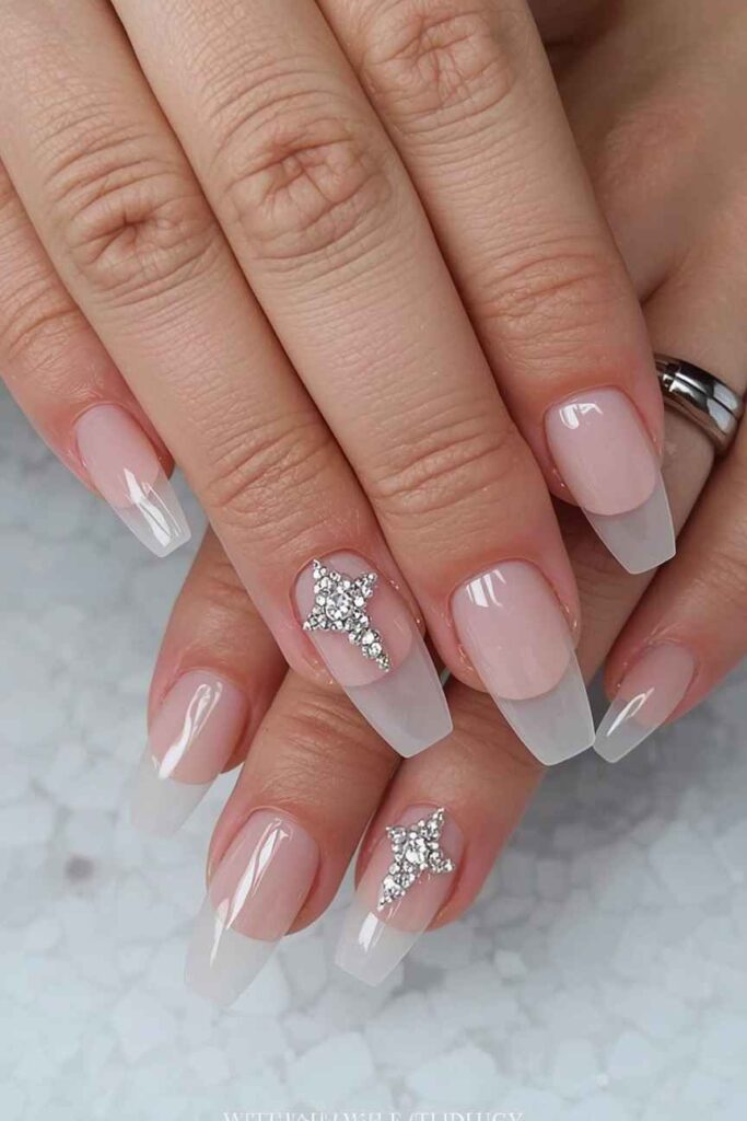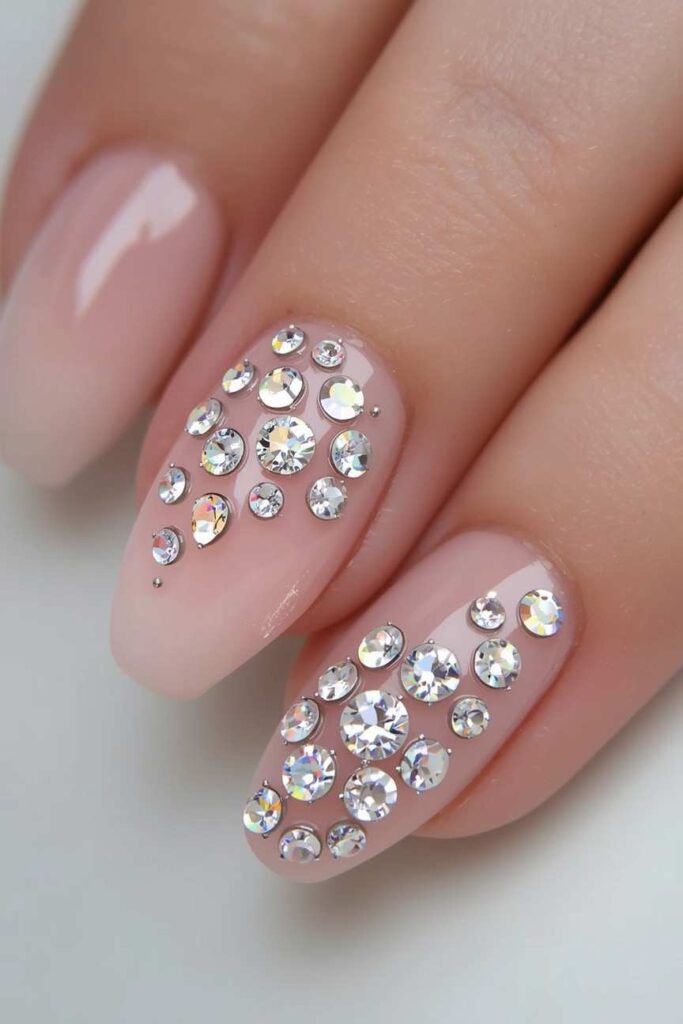 Sheer nude nails paired with small crystals add elegance and sparkle subtly. The nude base keeps the look understated, while crystals enhance radiance and sophistication. Perfect for brides who want a chic, luxurious manicure, this design is both timeless and eye-catching, creating a polished, glamorous bridal look.