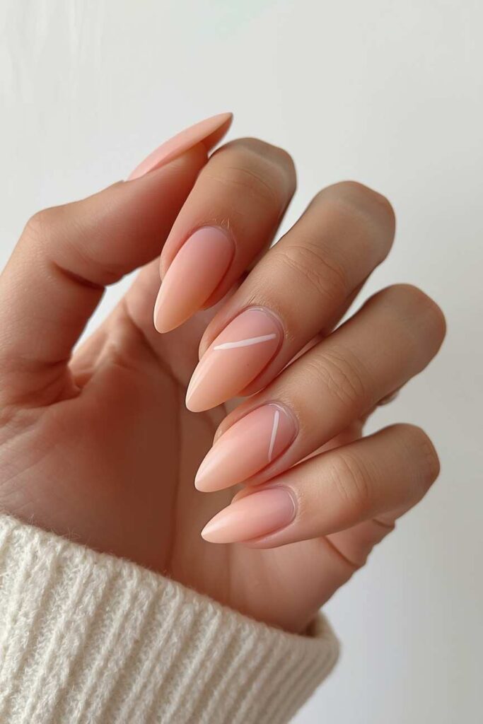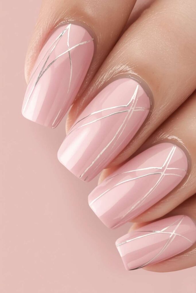 Soft pink nails with thin minimalist lines create a modern, artistic effect. Simple geometric accents or delicate stripes add sophistication without overpowering the manicure. Perfect for contemporary brides, this style balances elegance and creativity while maintaining timeless appeal. Minimalist lines complement soft gowns and accessories beautifully.