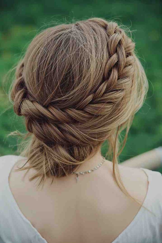 A fishtail braid pinned into an updo creates a textured, boho-inspired hairstyle. It’s eye-catching without being over the top.