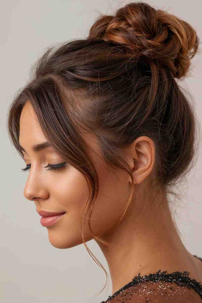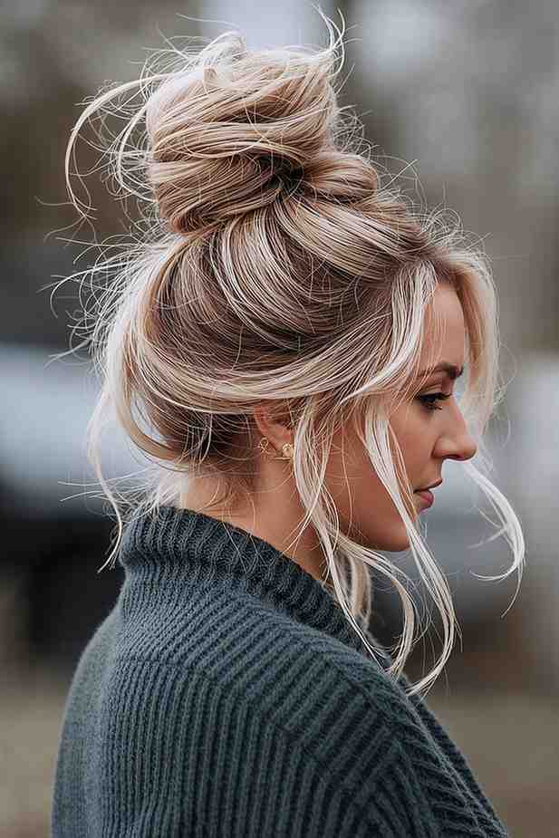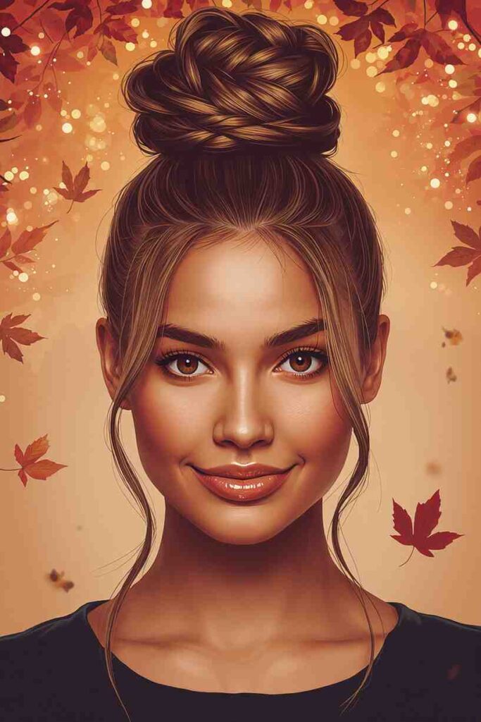 The messy top knot combines casual charm with effortless chic. Perfect for cooler days when you want your hair up and away, it suits busy mornings and casual outings. Its undone look pairs beautifully with cozy autumn outfits.