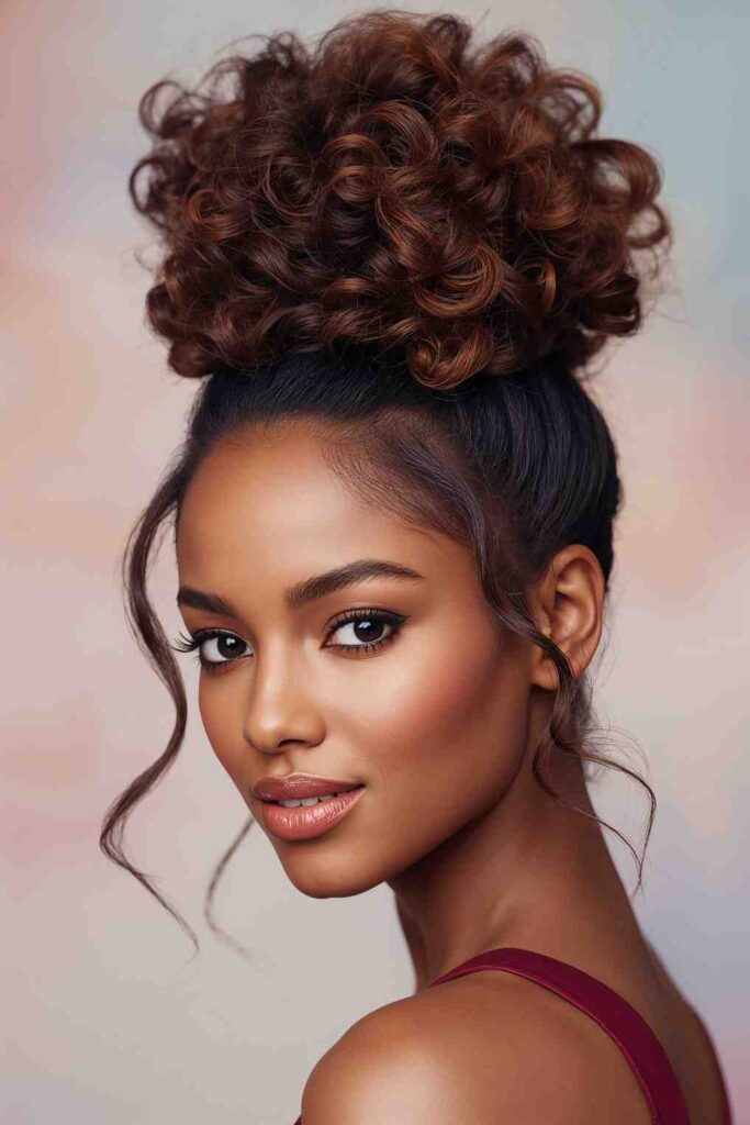 A high bun styled with natural curls is bold and beautiful. It celebrates texture while keeping your hair up and stylish.