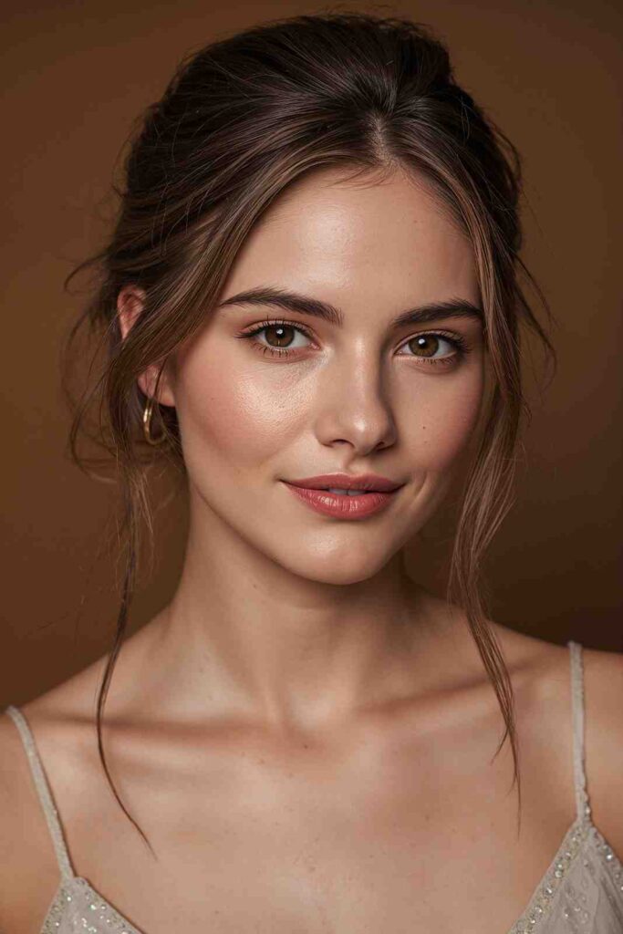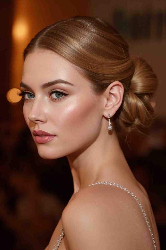 The loose chignon exudes effortless charm. With its softly pinned strands, it works perfectly for fall weddings or elegant dinners.