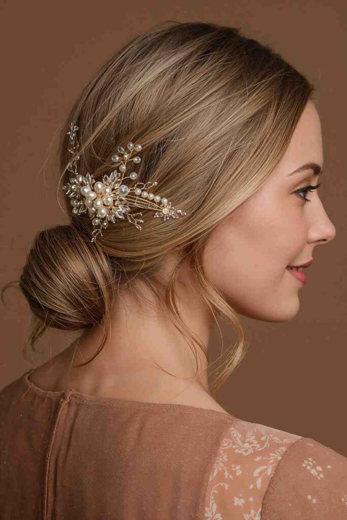 Adding autumn-themed accessories—like pearl clips or jeweled pins—to a low bun transforms it instantly into a classy updo.