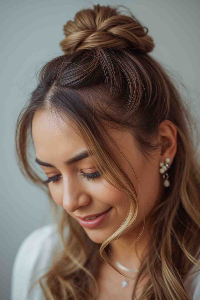 A half-up bun with twisted strands offers the best of both worlds—up and down. It’s casual, fun, and autumn-appropriate for everyday styling.