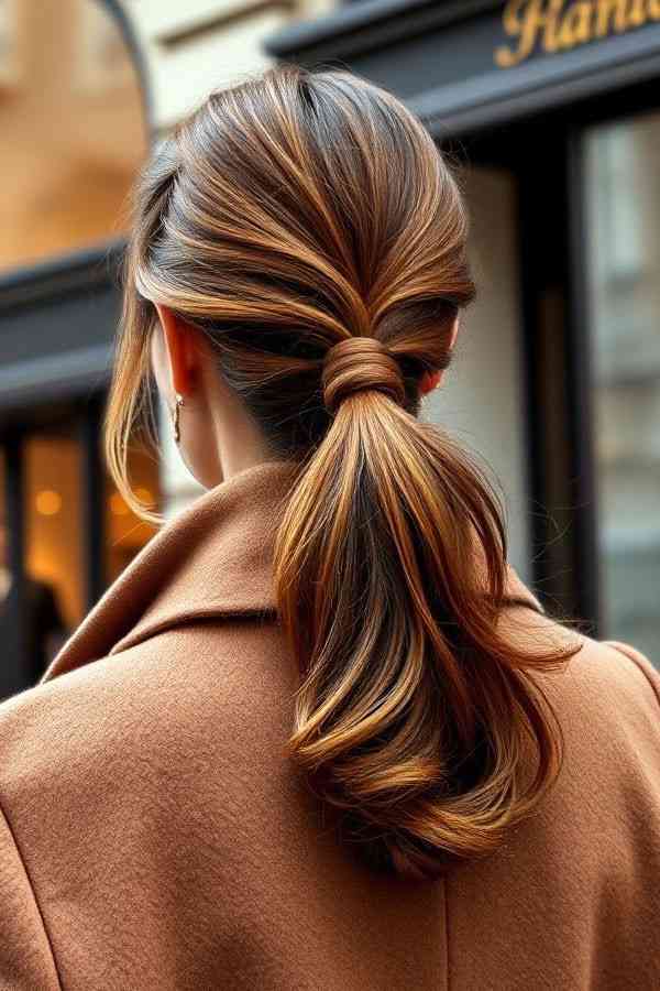 Wrap hair around a low ponytail to create a chic updo alternative. It’s sleek, modern, and perfect for autumn sophistication.