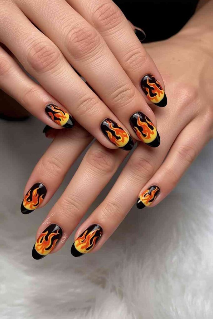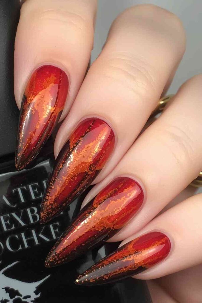 Blend deep red, orange, and black polishes to create a fire-inspired ombré. Add gold accents for a molten, infernal effect. These nails radiate power and energy, perfect for bold personalities or demonic costume themes.