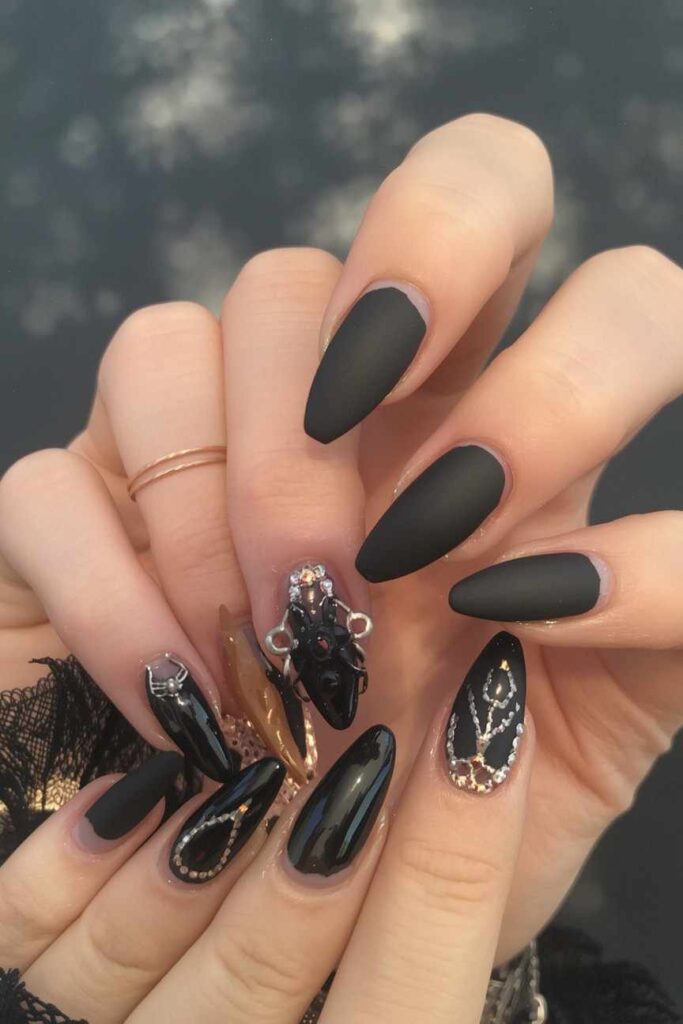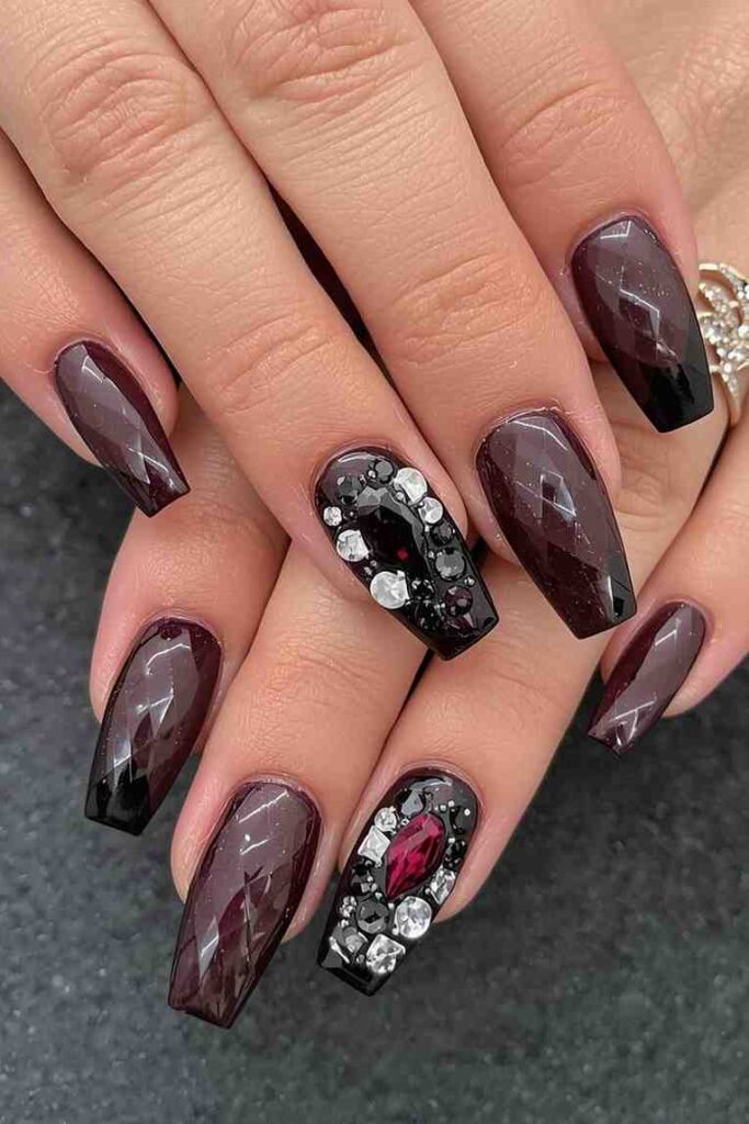 Coffin-shaped nails encrusted with crystals and dark jewels make a haunting statement. Pair black or burgundy polish with rhinestones for a luxe touch. The sparkle against dark tones feels both sinister and high-fashion — a perfect combo for Halloween glamour.