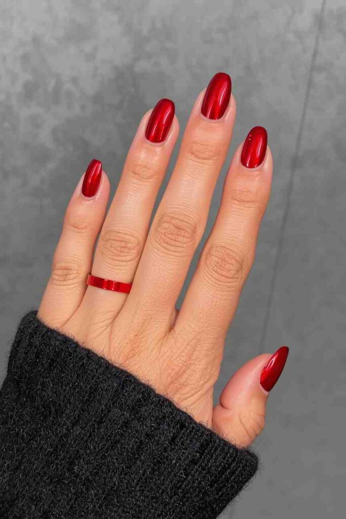 Nothing says “Halloween slay” like metallic blood-red nails. The mirror finish catches the light beautifully, adding intensity to your sharp manicure. It’s sleek, dramatic, and ideal for vampire-inspired looks. Pair with dark lips and bold rings for a truly killer effect.