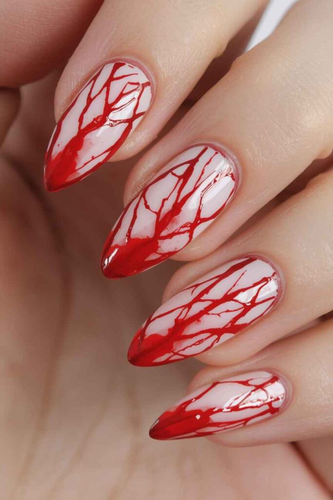 Mimic blood veins across a milky base using fine red lines. The translucent effect adds an unsettling yet artistic edge. This realistic detail makes your nails look hauntingly beautiful — perfect for creepy costume vibes.