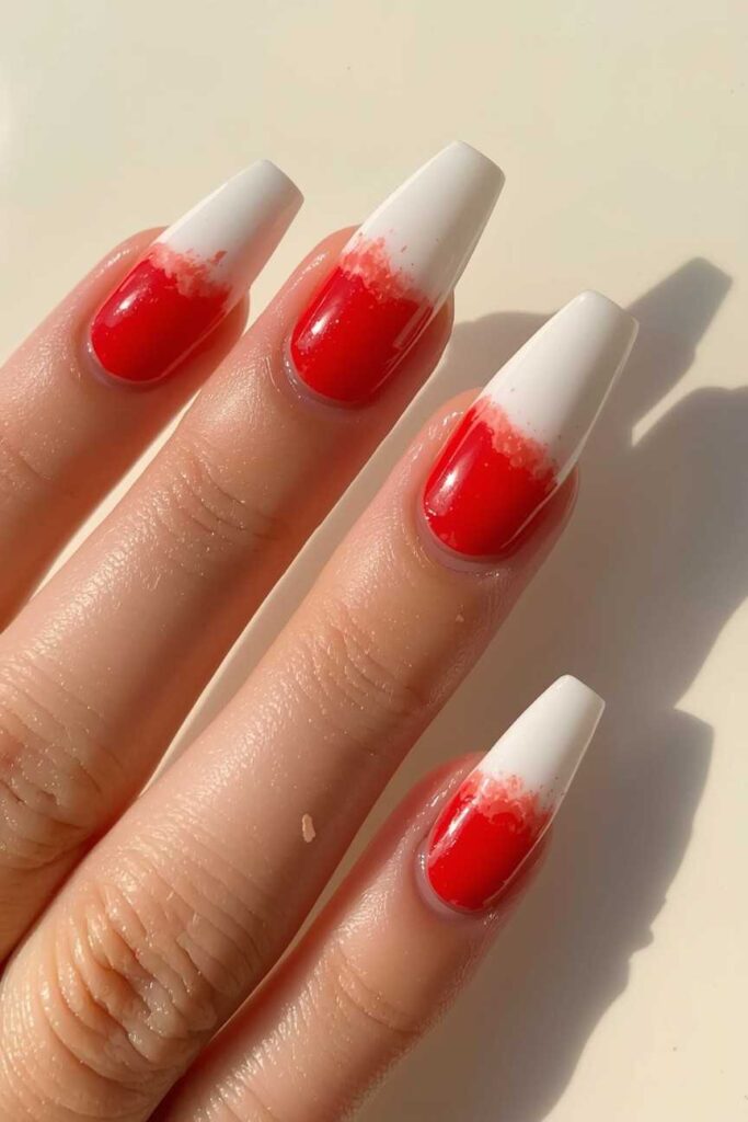 Take your classic French manicure and add a terrifying twist! Paint your nails nude or light pink, then create dripping red tips that look like blood. The glossy finish enhances the “wet” effect, adding realistic gore to your glam. It’s an easy DIY idea that’s both creepy and captivating — perfect for Halloween parties or horror-themed looks.