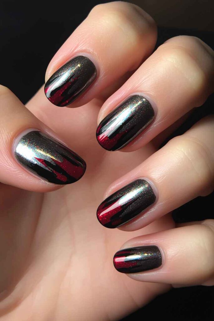 A high-shine chrome base with black or red “drip” details creates a futuristic yet bloody illusion. The contrast of metallics and dark tones gives this look a fierce, edgy flair. It’s bold, unforgettable, and looks incredible under party lights.