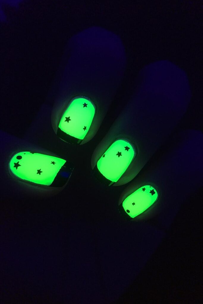 Neon green paired with black tips gives off classic witch energy. Add tiny stars or potion bubbles to enhance the theme. The bright color glows under UV light, making this one perfect for Halloween parties and night events.