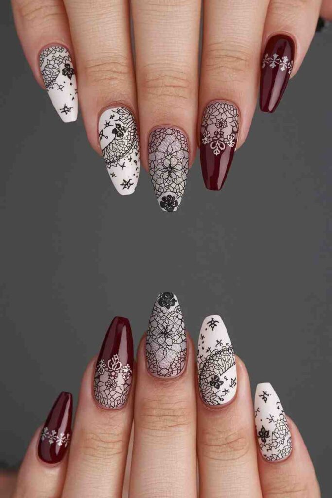 Elegant and eerie, gothic lace nails feature intricate black lace patterns over a nude or sheer base. Add matte topcoat for a soft, fabric-like effect. This design works perfectly for gothic brides, vampire queens, or anyone who wants subtle sophistication with a spooky undertone.