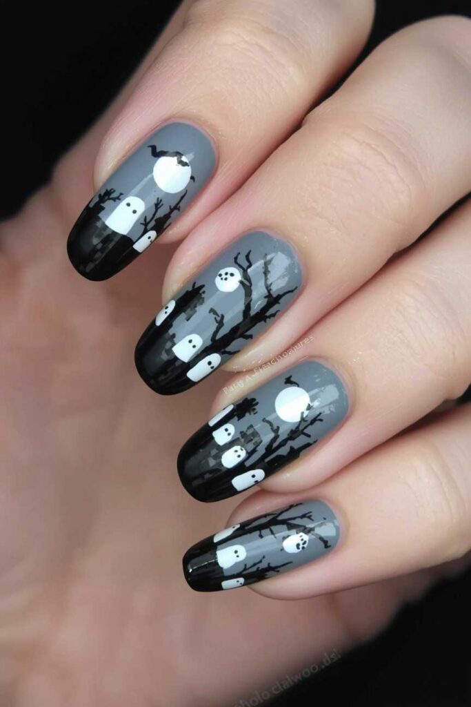 Create a hauntingly beautiful ombré by blending white into gray and black. Add tiny ghost decals or hand-painted figures for a playful touch. The gradient effect gives your nails an ethereal, floating vibe — spooky but still chic. This design is great if you love minimalist Halloween art with a twist.