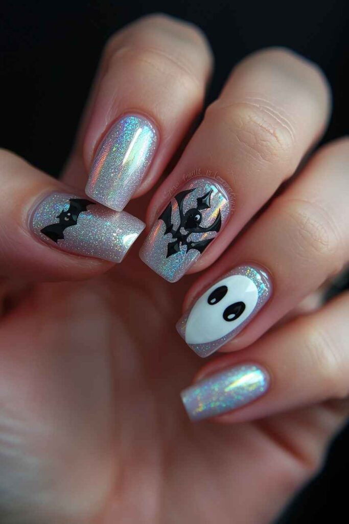 Combine holographic polish with spooky art like ghosts, bats, or eyes. The iridescent background adds an enchanting glow that shifts with the light. It’s fun, futuristic, and perfectly eerie for a stylish Halloween statement.