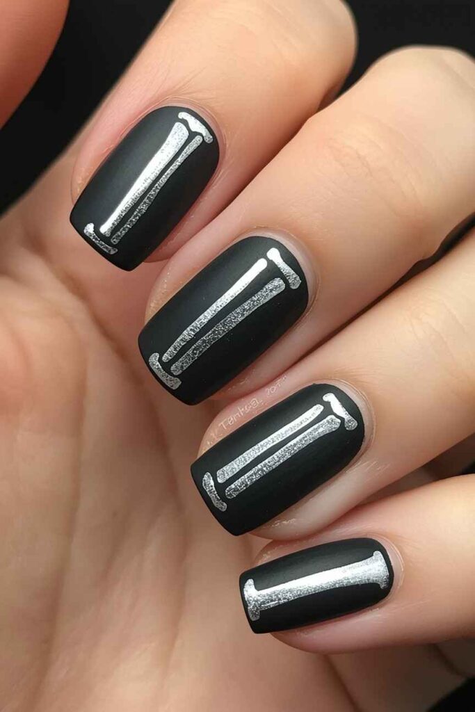 Paint silver or gold skeleton bone outlines over a matte black base. The contrast looks stunning, and the metallic touch gives it an armor-like effect. This design feels bold, fashionable, and unmistakably Halloween.