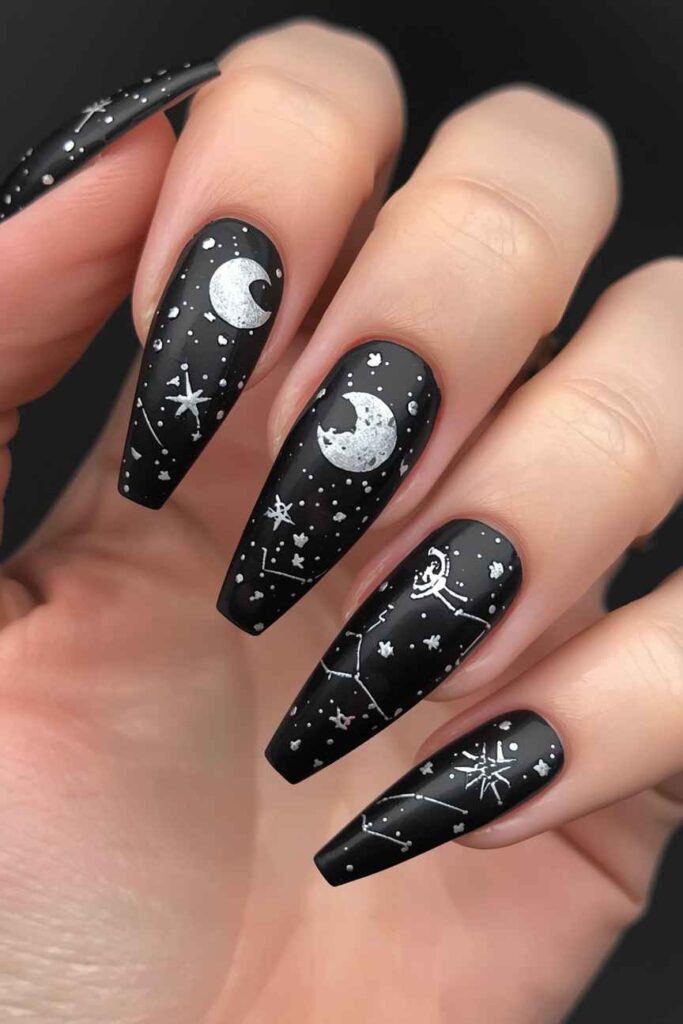 Channel celestial vibes with black nails featuring silver moons, stars, and constellations. Use metallic polish or nail stickers to create the night-sky effect. These long nails look mystical and stylish — ideal for anyone who loves the witchy aesthetic or dark glamour.