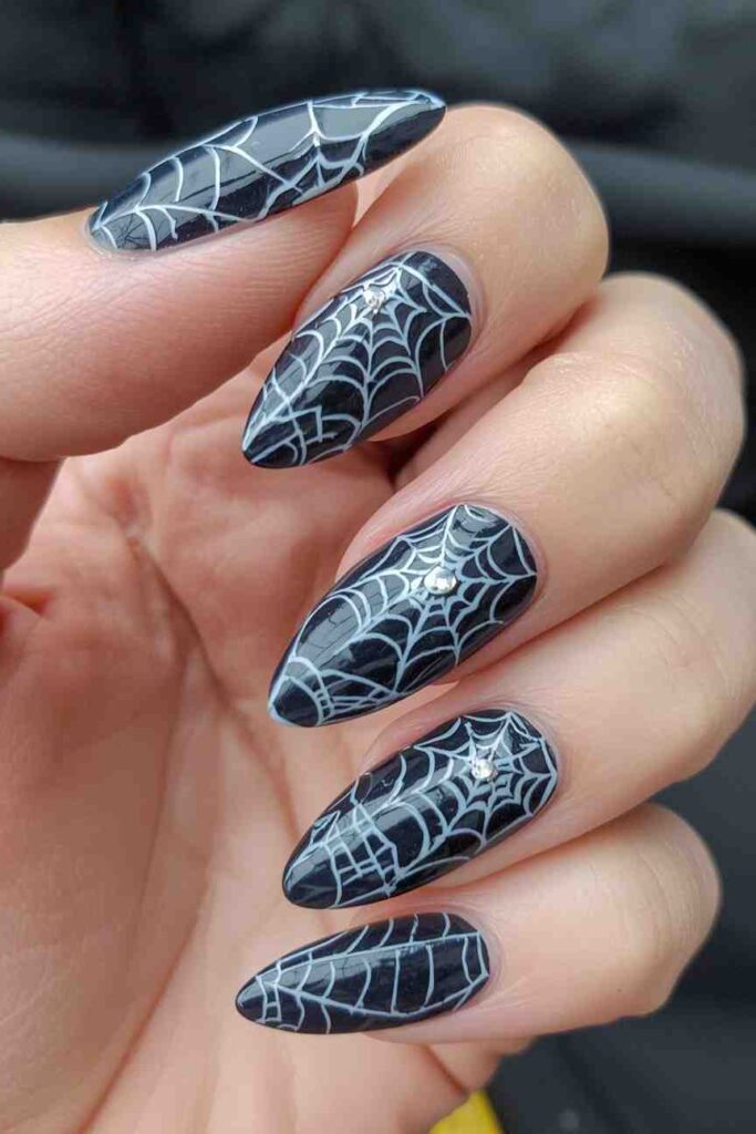 A smoky black-gray base with delicate white spiderwebs adds eerie sophistication. Use fine brushes or nail stickers to create intricate webs across one or two accent nails. Add a small rhinestone “spider” for dimension. This design strikes the perfect balance between dark and elegant, giving your long nails a mysterious, midnight appeal.