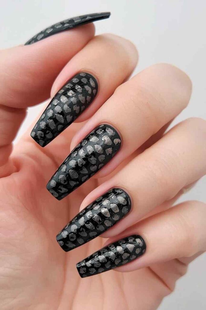 Add texture to your long Halloween nails with snake-skin patterns. Use black polish with metallic overlays or nail foils for a scaly effect. This serpentine design adds danger and seduction — perfect for mysterious, powerful Halloween vibes.