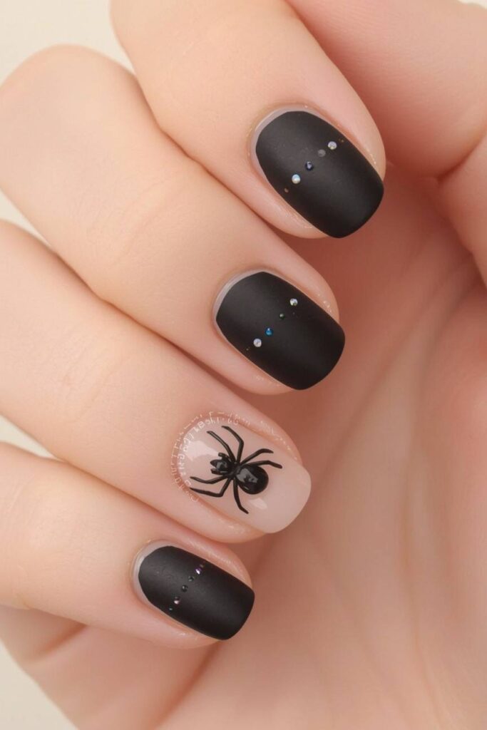 Keep it minimal yet creepy by adding a single 3D spider on one nail. Use a matte black base and a shiny topcoat for contrast. Add tiny gems for eyes to make the spider pop. This detail brings instant Halloween drama to any manicure.