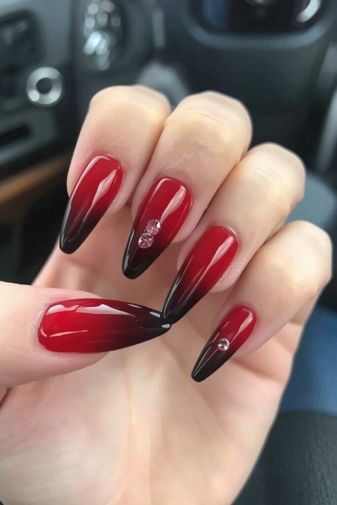 Long red nails with subtle black fading at the tips resemble vampire bites. Add a touch of shimmer or two small gem “fang marks” near the cuticle for creativity. This seductive design is perfect for those who love horror elegance.
