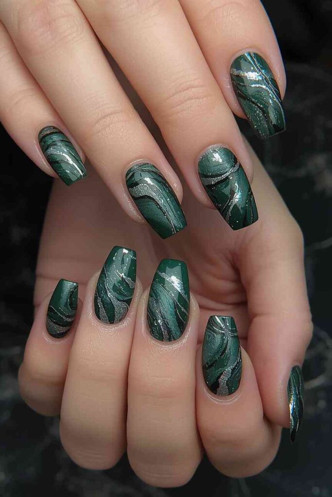 Marble nails get a spooky upgrade with shades of emerald, black, and metallic silver. The swirling patterns mimic magical potions or witch’s smoke. Add a glossy top coat for depth or sprinkle fine glitter for shimmer. These nails are powerful and mysterious, making them ideal for any witch-inspired Halloween ensemble.