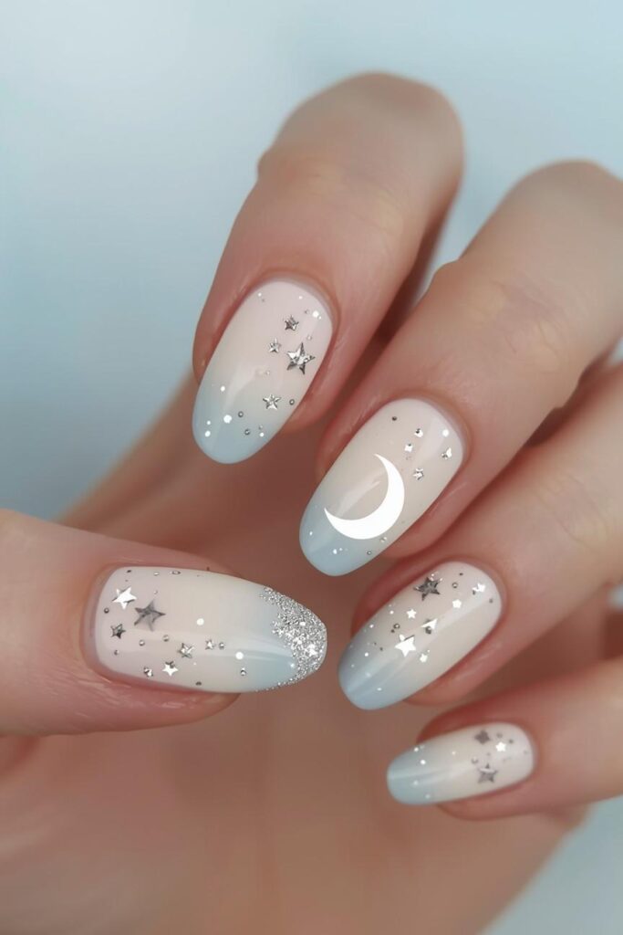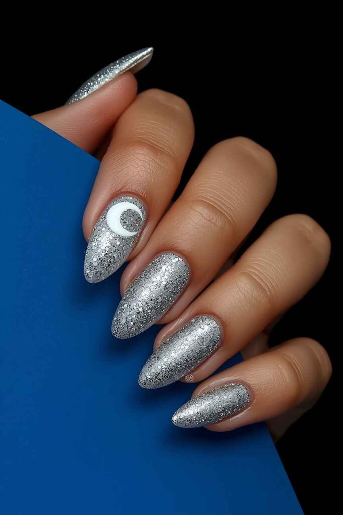 Apply a small silver glitter moon to one nail. Keep the base neutral. This design adds a magical Halloween touch while staying minimal, elegant, and versatile for different occasions.