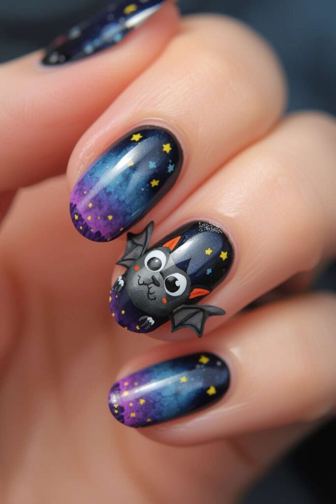 Draw one small bat on an accent nail. Keep all other nails neutral. The tiny bat is playful yet subtle, giving a hint of Halloween fun while maintaining elegance. Ideal for office or casual wear.