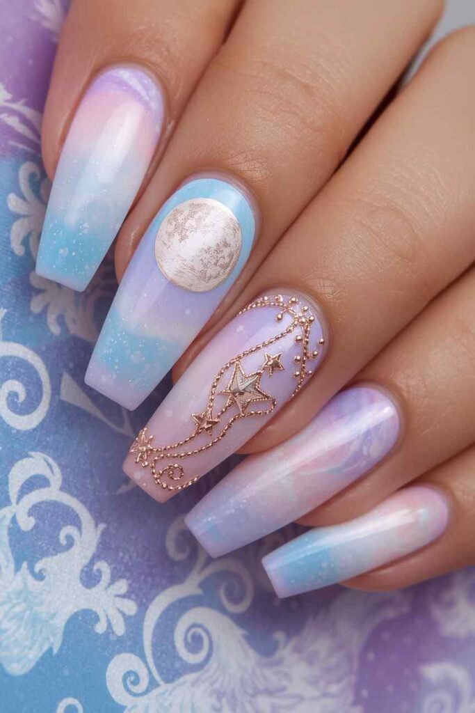 Create a small cluster of moons and stars on one accent nail. Keep the rest simple for minimal impact. This design is magical, stylish, and perfect for subtle Halloween nails.