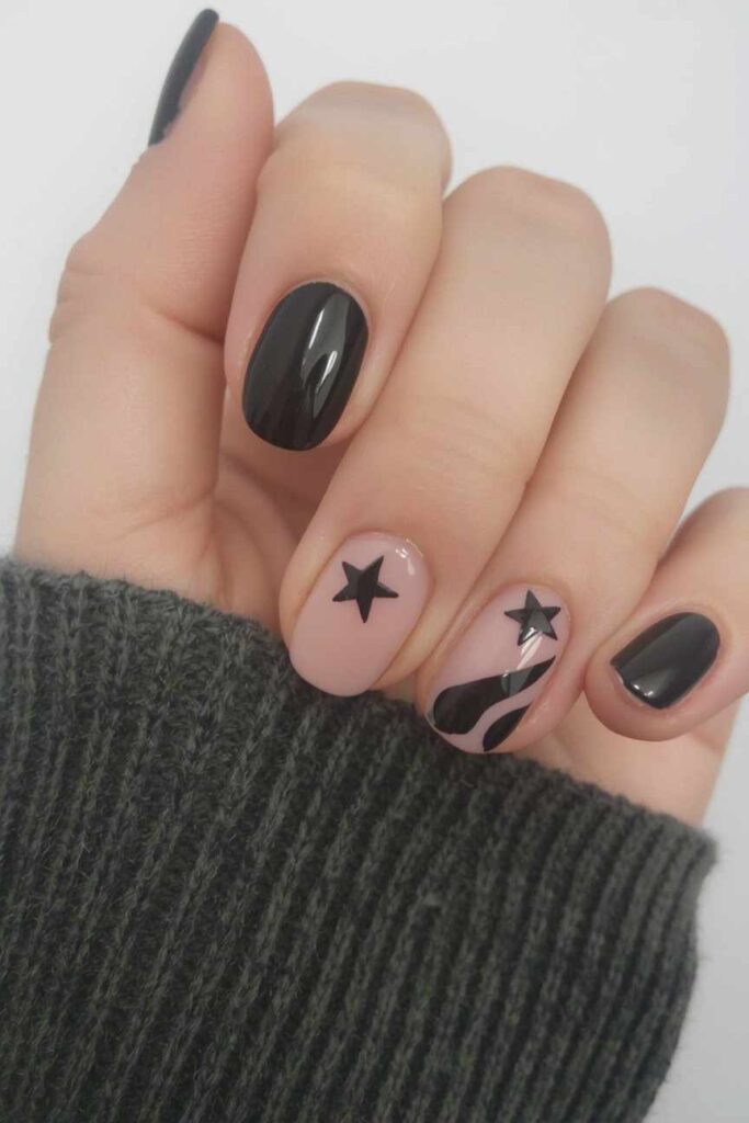 Add a small black star to an accent nail. Pair with soft-colored nails for minimal contrast. The simple star adds a witchy Halloween vibe without overwhelming the design.