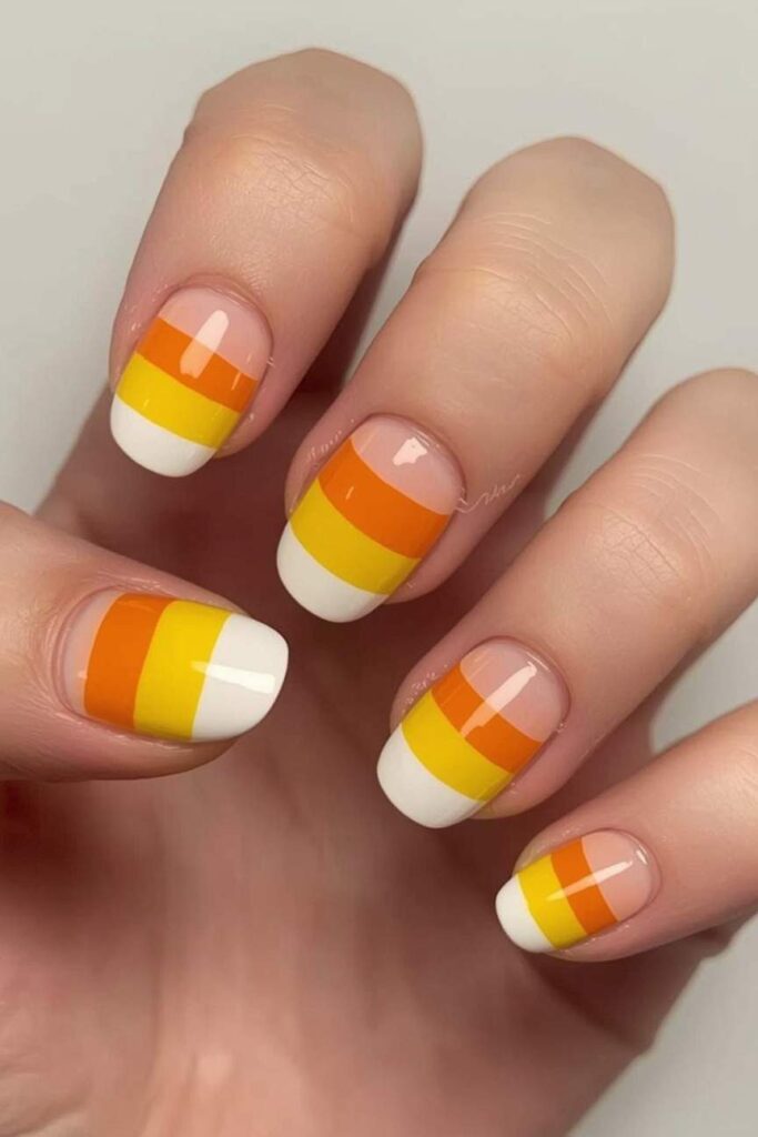 Add a simple candy corn stripe to one nail. Keep the rest neutral or pastel for balance. This minimalist take on a classic Halloween treat is cheerful, playful, and subtle, making it perfect for those who want a festive element without busy patterns.